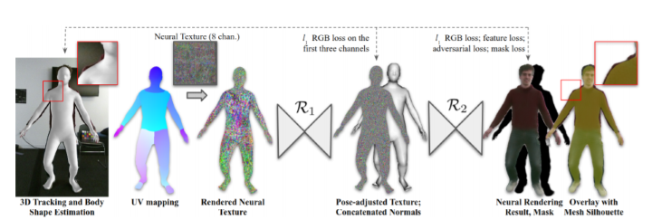 ANR可以生成关节对象的高度详细表示。传统的渲染管道使用高分辨率的网格和详细的RGB纹理,而研究人员则使用低分辨率网格和高维神经纹理,并使用一个神经网络从新视图渲染详细的RGB外观。
