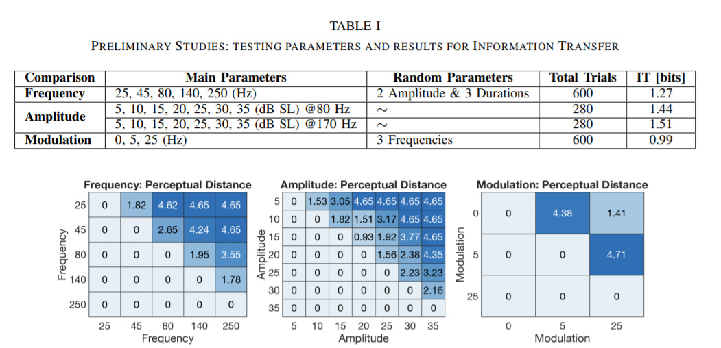 在初步研究中,研究人员计算了三个信号参数(频率、振幅和正弦波形的调制)中的每一个在腕背的信息传递。另外两个参数要么固定,要么随机变化。表1显示了主要信号参数、随机参数刺激和每个测试阶段收集的试验总数的总结。初步研究的结果得出了每对刺激方案之间的知觉距离和沿测试维度的触觉信号的显著参数指示。