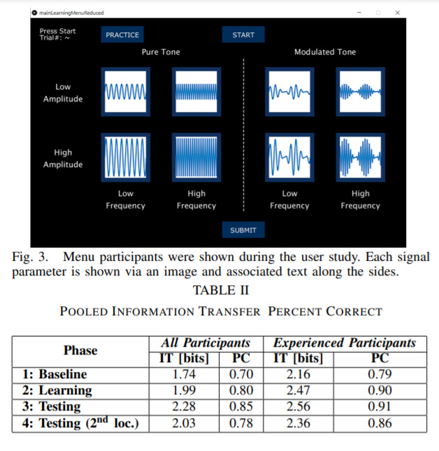 在每个测试环节中,被试熟悉UI,并测试信号以获得对值范围的一般理解,但没有完成正式训练。一旦感到舒服,被试就开始学习。在每一次试验中,在触觉间隔开始之前都有一个简短的音频音调。在每个试验中随机选择主要参数。在触觉间隔之后,被试通过在UI选择相应的选项来记录反应。在频率识别任务中,为每个信号随机选择两个振幅(15和25 dB SL)和三个持续时间(100、250、500 ms),并为被试提供5个响应选项。对于振幅识别任务,团队提出了七个测试刺激,并为两个测试频率中的每一个提供了七个相应的反应选择。每个刺激的持续时间设置为250ms。对于调制识别任务,研究人员用三个随机载波频率(45、80、140hz)测试三个测试调制(无、5hz和25hz调制)。振幅和持续时间分别设置为25 dB SL和250毫秒。为了解变量是如何影响主要参数的,同时缩短实验时间以减少被试的疲劳感,团队加入了随机参数。在每次试验中,被试需要报告主要参数的值,而不考虑随机参数的值。试验分为20个试验区,被试根据需要在两个试验区之间休息。被试在一天内完成了每一次对比测试。