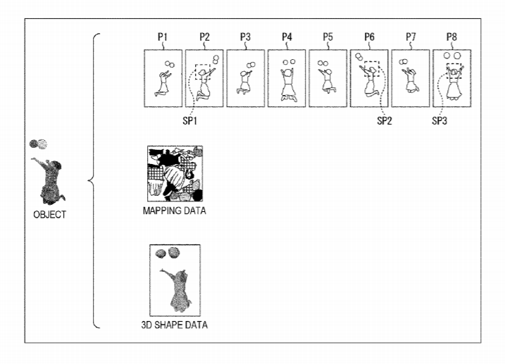 专利描述的生成装置包括生成单元,其生成表示对象的3D形状的3D形状数据、作为对象的二维映射纹理信息的映射数据、以及通过从一个或多个视点位置捕获对象而获得的一个或多个捕获图像的特定区域的区域图像数据。