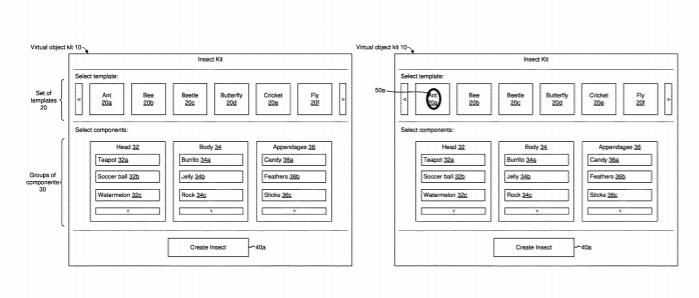 在一个实施例中,一种方法包括获取虚拟对象套件,其包括一组特定虚拟对象类型的虚拟对象模板。在一个实施例中,虚拟对象套件包括多组组件。在一个实施例中,多组组件中的每一个与虚拟对象的特定部分相关联。在一个实施例中,所述方法包括接收合成虚拟对象的请求。在一个实施例中,请求包括从多个组件组中的至少一些中选择组件。在一个实施例中,所述方法包括根据请求合成虚拟对象。