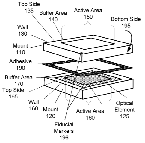 一种安装件包括光学元件可位于其中的有源区域。使用放置在安装件壁结构顶部的粘合剂将安装件粘合到相邻安装件上。通过使用凹槽结构和微壁结构防止粘合剂从安装件壁迁移到有源区域,凹槽结构和微壁结构位于安装件缓冲区域内,所述缓冲区域限定了有源区域。在一个实施例中,扩散器位于安装件的缓冲区中,以根据特定应用的需要重定向发射光。