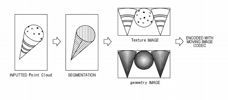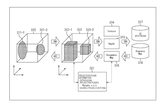 专利描述的方法包括,变换与点云的多个点云模型相关的参数,对具有变换参数的多个点云模型投影到的二维平面图像进行编码,以及生成包含二维图像的编码数据和作为关于参数变换信息的比特流。