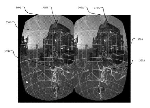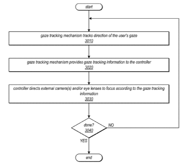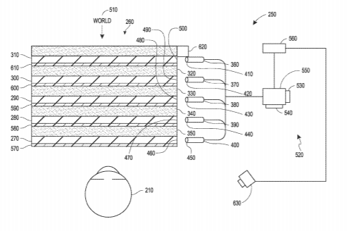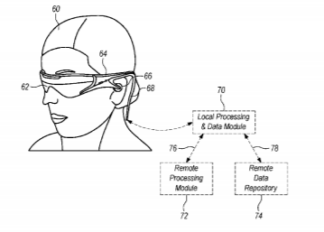 专利描述了一种眼戴设备。所述设备可以包括一个面向外部的头戴式光场摄像头,其用于接收来自用户周围环境的光线并生成数字光场图像数据。所述设备同时可以包括光场处理器,其访问数字光场图像数据,获取用户眼睛的视力参数,并基于光场图像数据将正或负屈光度的计算值引入到数字光场图像数据中。根据视力参数生成修改后的数值光场图像数据。所述设备同时可以包括头戴式光场显示器,从而生成与修改后的数字光场图像数据相对应的物理光场。