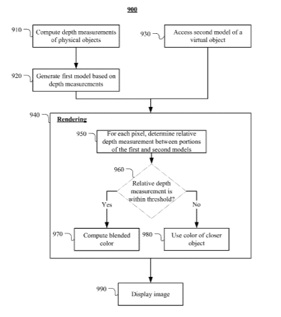 计算系统可以计算用户周围的物理环境中至少一个物理对象的估计深度测量。基于估计的深度测量,系统生成物理对象的第一模型。系统可以基于虚拟对象的第一模型和第二模型,从用户的角度呈现描述物理对象和虚拟对象的图像。图像的至少一个像素具有对应于物理对象的一部分和虚拟对象的一部分的混合颜色。响应于确定与物理对象部分相对应的第一模型部分和与虚拟对象部分相对应的第二模型部分之间的相对深度在阈值内,计算混合颜色。