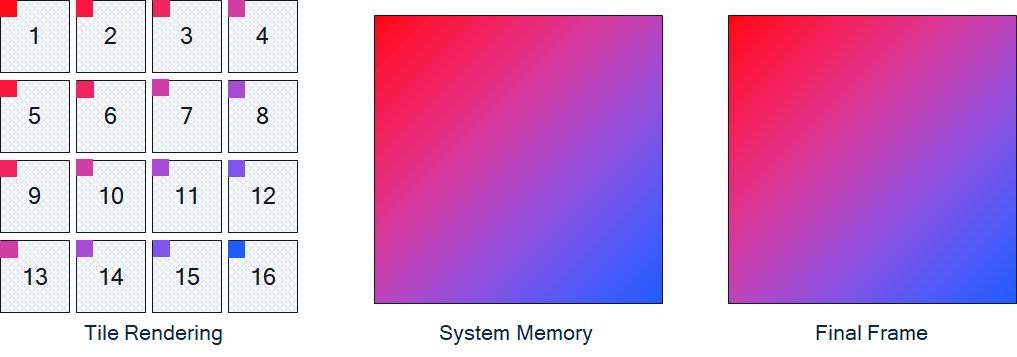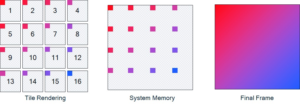 要支持Adreno GPU实现高效、高性能的注视点渲染,一个关键功能是Tile Based渲染方法。这种基于图块的注视点渲染将帧划分为一个个的图块,每个图块按顺序渲染到GPU的高速内存。当一个图块完成,最终结果就会发送到系统内存,而GPU将渲染下一个图块。这样,只需把最终帧内容复制到系统内存即可。应用程序为构造帧而执行的读取和重写操作都是利用本地高速存储器来完成。下面,我们将讨论Adreno的Tile Based注视点渲染的发展。