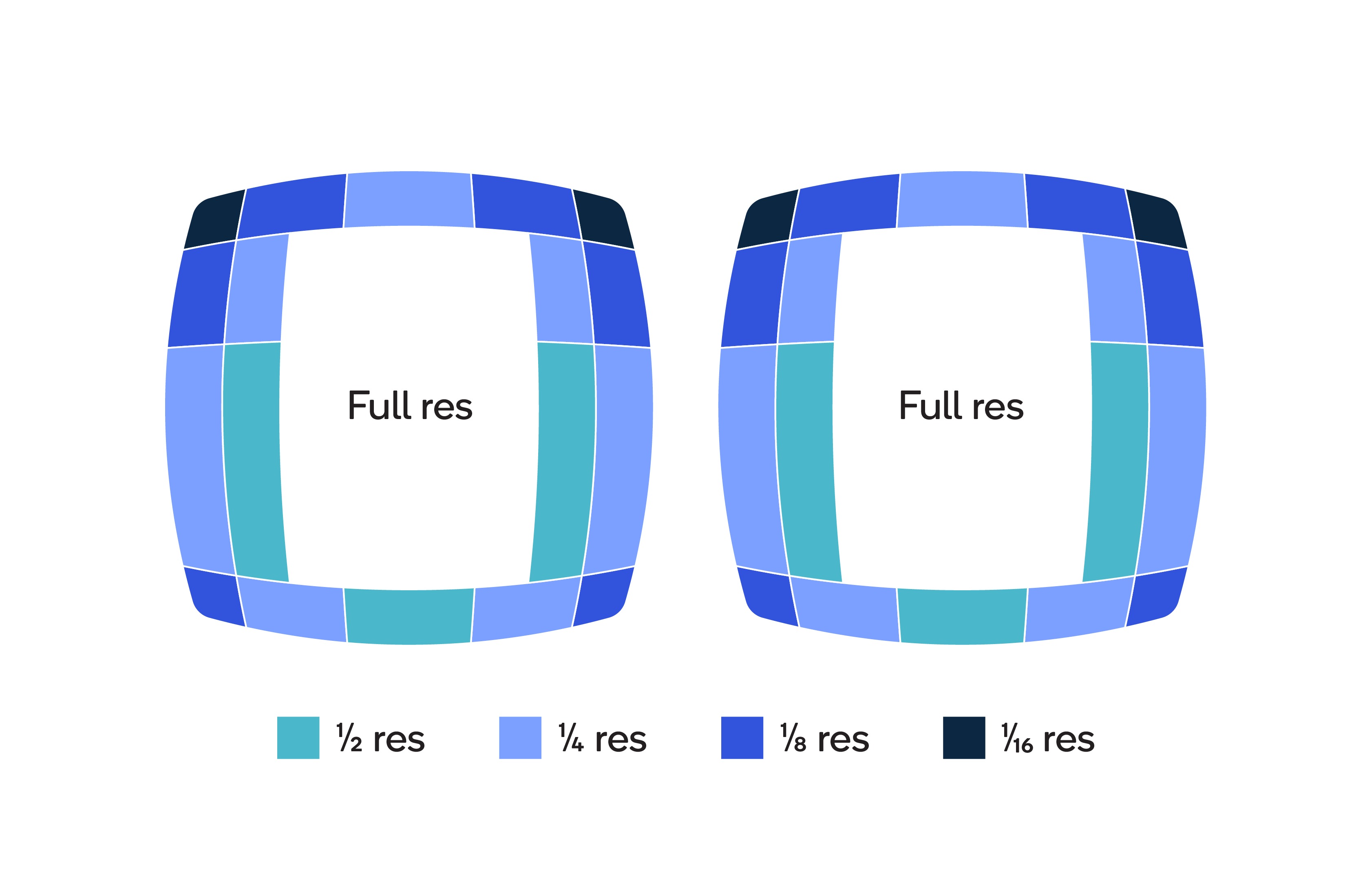 开发者可以使用注视点渲染来优化渲染性能,以满足VR对帧率和分辨率的高要求。注视点渲染是一种减少像素着色成本的技术。如图1所示,只在人眼注视区域以高分辨率渲染画面,外围则采用低分辨率。这可以减少渲染每个帧所需的时间和/或功率。