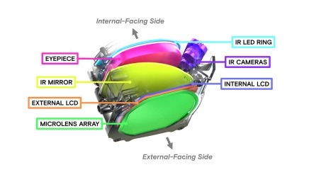 最终的头显包含两个彼此镜像的显示盒。它们具有一个LCD面板和用于基础VR显示的透镜。一圈红外LED照亮由裸架覆盖的人脸。在透镜和屏幕之间搭载一面只反射红外光的镜子,这样红外摄像头就可以几乎正面地观察眼睛。在不可见的红外波段进行所述操作可以避免眼睛成像系统分散用户对VR显示器本身的注意力。然后,裸架的前端包括另一个带有微透镜阵列的LCD。