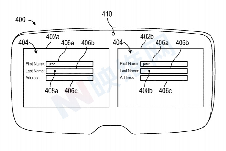 苹果专利图4展示了一种内置注视点传感器的头戴式显示设备。在一个实施例中,用户能够在虚拟现实世界或真实世界环境中查看表格,并且能够将文本输入定向到由注视点传感器检测到的表格特定区域。据描述,这项技术可以非常精确,从“名字”输入框到下一个框“姓氏”的轻微注视变化可以精确检测,所以用户无需鼠标即可填充方框。