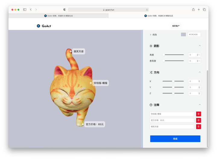 完成3D模型构建后,GoAct 3D也提供下载、编辑、分享等后续功能。下载功能目前只提供不同模型精度的glb格式,如果有其他3D格式需求,目前则需要再通过其他工具进行格式转变。编辑功能主要是针对3D模型的环境、信息展示等进行完善,涉及模型背景色、光照阴影、初始展示位置等,支持自动旋转、放大缩小等,后续还将推出分类模版、3D盒等功能,实现更智能化的编辑。