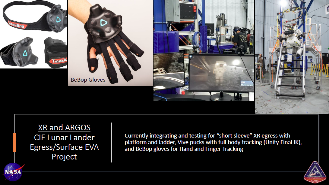 )美国航天局为其登月项目的主动响应式重力卸载系统(Active Response Gravity Offload System;ARGOS)增加了AR/VR功能。名为Artemis Lunar Surface VR/ARGOS Trainer的项目是已经构建的能够通过最佳可用数据来创建月球南极的精确数字表示的独特工具,并可用于在弱重力环境中进行EVA(舱外漫步活动)规划和培训。