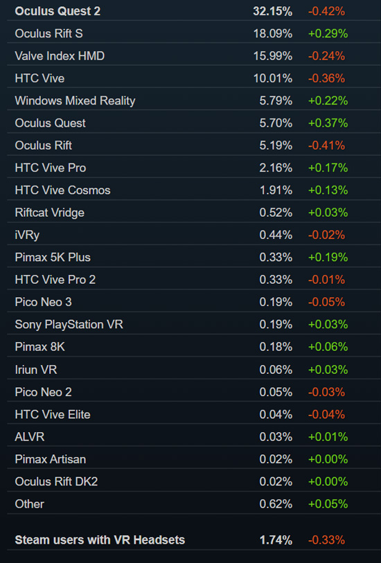 的旗舰头显依然凭借32.15%的占比牢牢占据Steam第一头显的宝座。