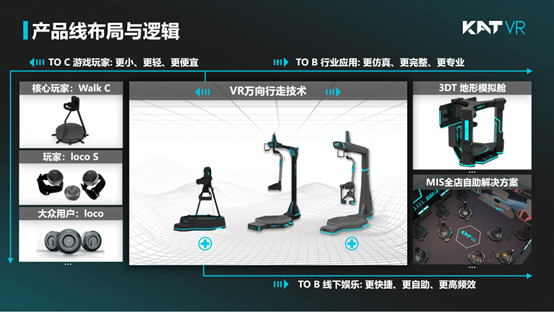 KATVR基于VR跑步机技术展开产品线,三大核心业务版块分别为:TOC游戏玩家市场、TOB行业应用市场和线下娱乐市场。