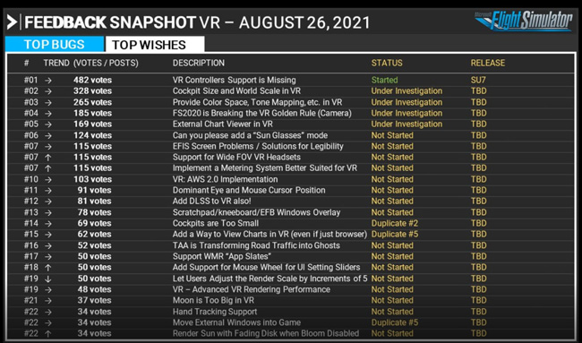 事实上,如果你查阅“虚拟现实相关功能反馈”的玩家票选功能列表,你会看到VR控制器支持以482票成为玩家最渴望的功能。另外,相关状态已经从原来的“调查中”变成“已启动”,并且计划与Sim Update VII同时发布。