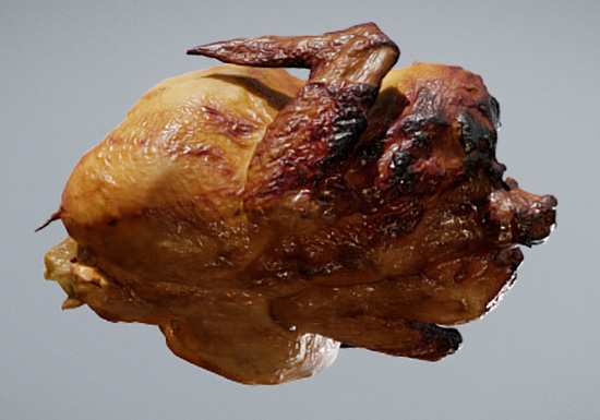 下面这个烤鸡模型是通过摄影测量创建的3D对象示例。创作者从不同角度拍摄了数千次的图片,这不仅是为了捕获简单的形状,同时是为了捕获次表面结构和照明。这个惊人示例背后的过程强调了为实现高质量效果而需要的巨大技能。