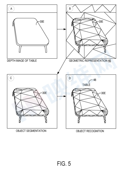 图5示是表面重建和分解管道示例。图5A是头显摄像头获取的深度图像。在表面重建和分解管道中,通过表面重建技术处理深度图像,以生成物理环境的几何表示。图5B是表面网格形式的几何表示示例。