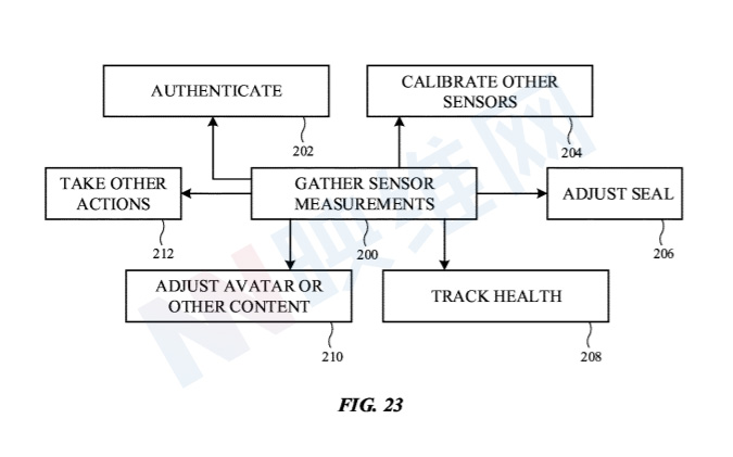 专利图23是示例性设别的操作流程图。苹果指出,面部传感器阵列可以沿着密封带延伸。不同的传感器测量用户面部的不同部分并收集信息,例如面部压力、面部运动、面部形状(从沿其长度位置处测量的密封厚度)和/或其他面部信息(肤色、肌肉活动、温度、心率、血流、血氧水平等)。