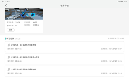 【学习记录/学情报告】完善的培训统计、评价和反馈机制。学员的学习、每一步的操作、考核等都会记录并同步至后台,可以通过设置端和学员端查看操作正误的详细信息及个性化学情报告。