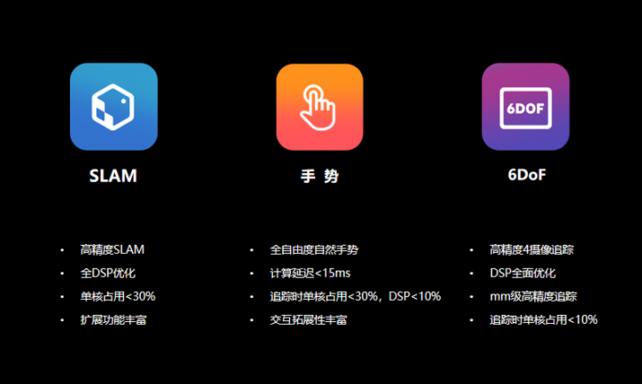 高精度SLAM算法可以实现全DSP优化,单核占用小于30%;自然手势算法计算延迟低于15ms,追踪时单核占用小于30%,DSP小于10%;基于CV追踪的6DoF手柄算法全面优化了DSP,可以实现毫米级高精度追踪,追踪时单核占用低于10%。