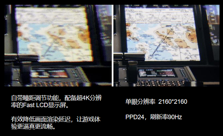在XR 2的加持下,骐骥配备两块独立2.89英寸的Fast LCD显示屏,超4K分辨率(单眼分辨率2160*2160),1058 PPI,PPD达到24,为目前同类产品最高。从测试图片可以明显看出,右侧“骐骥”所显示的单眼2K的效果更佳。96°大视场角加上90Hz刷新率,带来沉浸、流畅的画面观看体验。