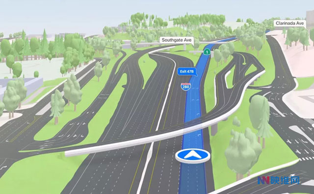 在使用AR导航时,用户现在可以看到详细的立体街道信息,包括车道标志、特殊车道(如自行车道和公共汽车/出租车车道)、人行横道等。公路和街道数据同样以3D显示,这样你在驾驶时就能够看到复杂的立交桥呈现等等。另外,利用苹果设备的高帧速率,苹果地图现在运行会更加流畅。