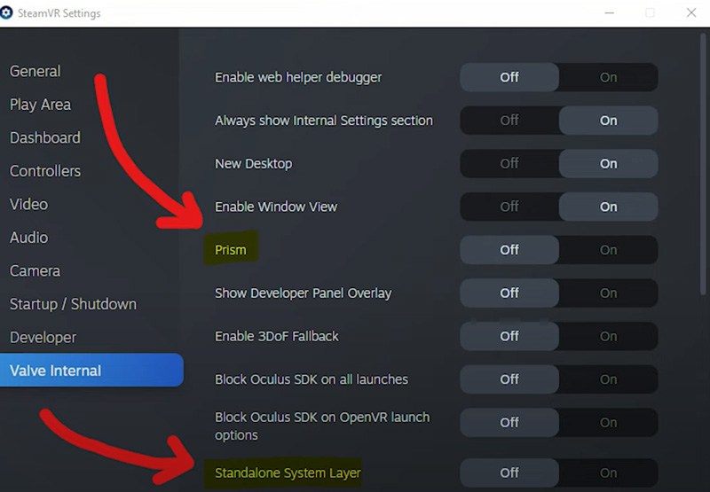 VR菜单选项的菜单:“Prism/棱镜”和“Standalone System Layer/独立系统层”。前一个选项意义不明,后一个选项则可能意味着硬件能够完全自行运作,无需插入PC或利用外置追踪传感器。
