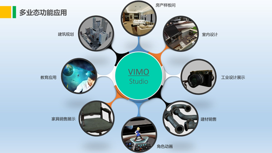 随着数字化时代与5G互联网的到来,现在的各行各业都在朝向数字化技术转型和加大研发,从而降低企业的推广成本、渠道成本、人力成本和管理成本。包括零售业、物流业、服务业在内的每一个传统行业都有机会借助数字技术转变成技术驱动的现代行业。比如:家居,装修,虚拟楼盘,汽车销售,网络购物,产品研发等等。VimoStudio 的开发愿景,就是为了打通现实世界和虚拟世界的壁垒,依托虚拟现实技术和三大硬件平台,让客户进入数字化产品的数字世界,并为你的客户带来前所未有的视觉体验。