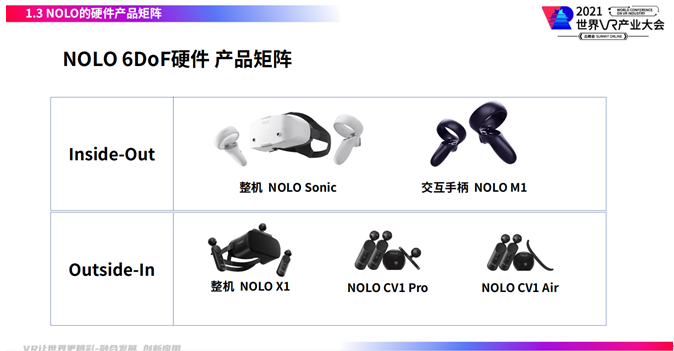 NOLO作为一家以技术为核心的VR品牌企业,业务产品一直聚焦在用户交互体验的提升以及VR一体机的迭代研发,自创始以来,NOLO始终坚持交互技术和移动硬件的“双驱动”发展,不仅实现了硬件的全面布局(如:NOLO Sonic、NOLO CV1系列),还实现了Inside-Out以及Outside-In交互技术的全面发展。