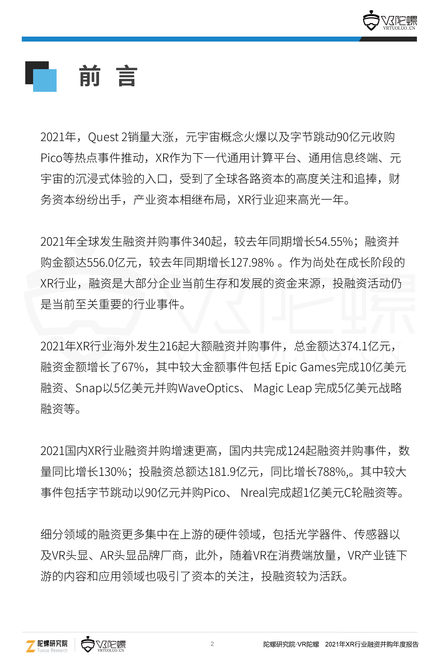 2021年全球发生融资并购事件340起,较去年同期增长54.55%;融资并购金额达556.0亿元,较去年同期增长127.98%。作为尚处在成长阶段的XR行业,融资是大部分企业当前生存和发展的资金来源,投融资活动仍是当前至关重要的行业事件。