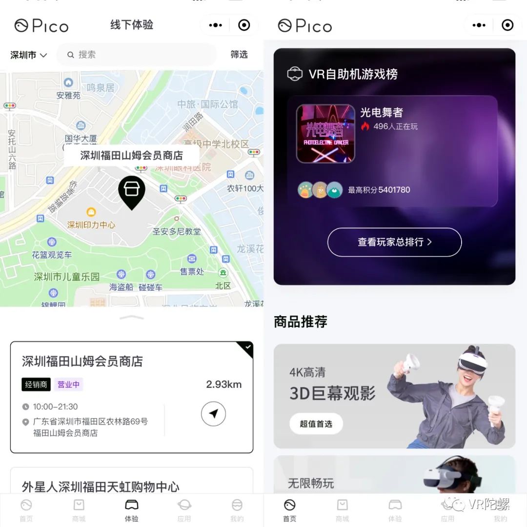 目前 Pico 线下可体验多款游戏,并且线下体验点与小程序打通,在小程序上可以查看到所有体验点的位置信息,以及玩家排名情况,同时还能在线上商店购买设备、查看游戏应用排行、个人中心、客服等模块,可谓是一站式营销服务。