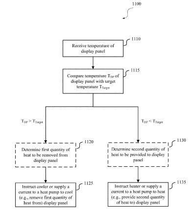 专利描述的系统包括显示面板、配置为测量显示面板温度的温度传感器、耦合到显示面板并配置为向显示面板传递热量或从显示面板传递热量的热电装置,以及电耦合到温度传感器和热电装置的控制器。控制器配置为接收显示面板的测量温度,并基于显示面板的测量温度,向热电装置发送第二信号,以使热电装置从显示面板移除第一量热量,或向热电装置发送第三信号,以使热电装置向显示面板提供第二量热量。