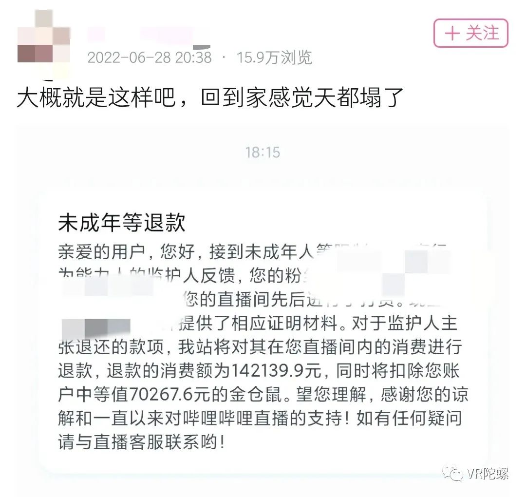 关于打赏问题,此前一条消息引起了网友热议。多名B站VTuber表示一夜之间收到未成年用户的退款需求,系统将从主播的收入(金仓鼠,B站与主播之间使用的虚拟货币)里扣除该未成年用户的直播间消费。因为扣除的费用与实际收入不对等,不少VTuber表示自己作为“小V”不仅没什么收入,甚至还将背负上万元的债务。