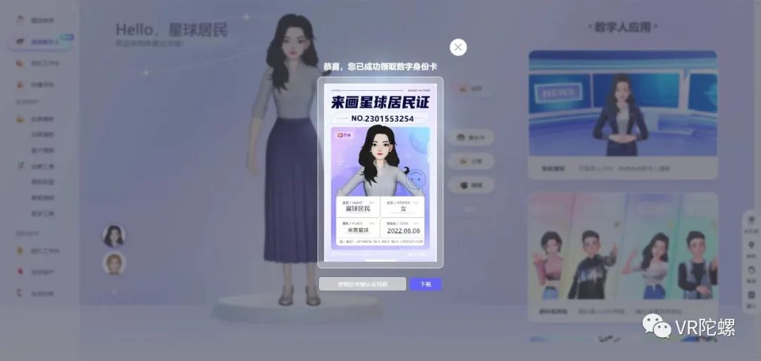 为了确保数字人创作归属权属于用户,来画还推出了元宇宙居民星球卡功能。来画指出,目前已经打通蚂蚁链,支持上链服务,每个人都可以生成自己的数字身份卡,而企业用户也可以沉淀自己的数字资产,这样就能确保数字人具备ID唯一性、独特性以及永久性。