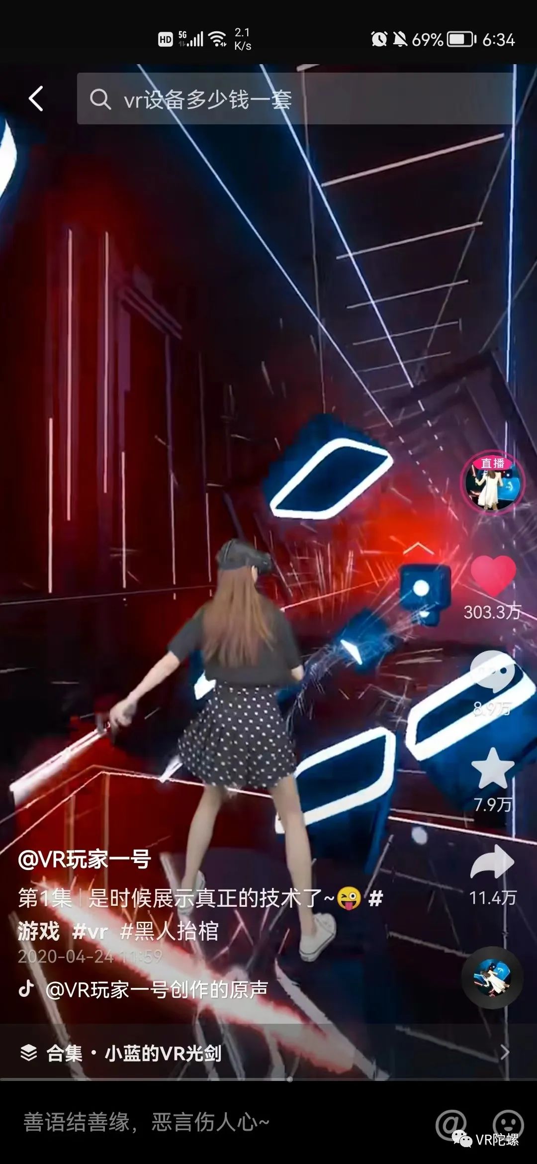 过去几年时间,VR玩家一号《Beat Saber》MR视频率先成为爆款,解锁了属于VR的流量密码。随着VR玩家一号粉丝火爆视频的持续输出,VR玩家一号及其演绎者小蓝也成了VR短视频领域的代表IP及达人。