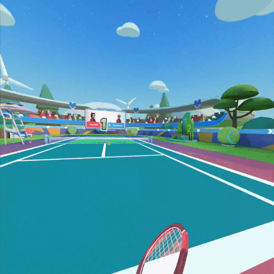 以“决胜网球”为例,陀螺君在进入该世界之后,可以通过屏幕的新手教程进行学习,掌握之后会自动匹配玩家展开1v1对决。游戏的玩法也很简单,不需要移动,也没有复杂的规则,只需要按准时机挥拍、击打接球。
