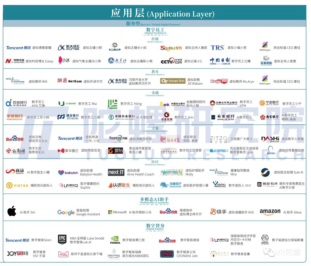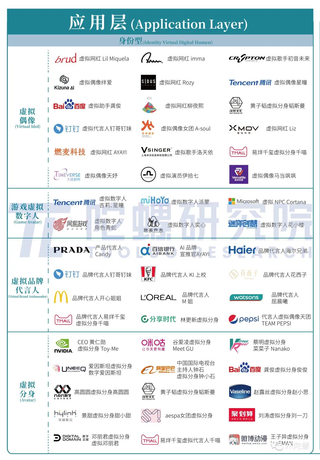 应用层是指虚拟数字人商业落地应用。依据应用场景划分为身份型虚拟数字人、服务型虚拟数字人两种类型。