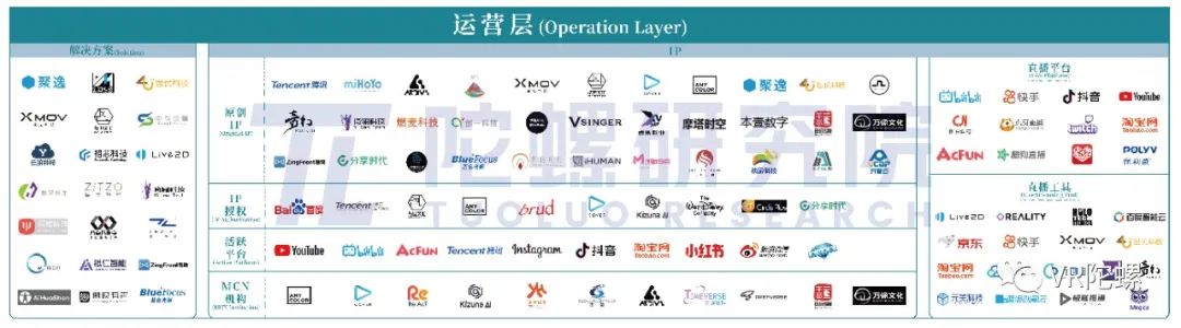 拆分IP运营服务,从虚拟数字人IP孵化至IP价值打造,期间参与环节又可分为原创IP、IP授权、活跃平台、MCN机构、直播平台及直播工具,每个环节聚集的企业众多。