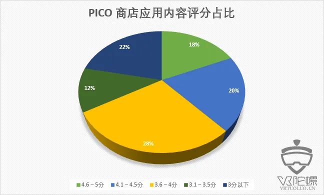 PICO 商店的满分为5分,在“娱乐”和“应用”类目中,超过及格线(3分)以上的作品占比分别为79%和78%,一般概念里的佳作(3.6分以上)的比例则为63%和66%。