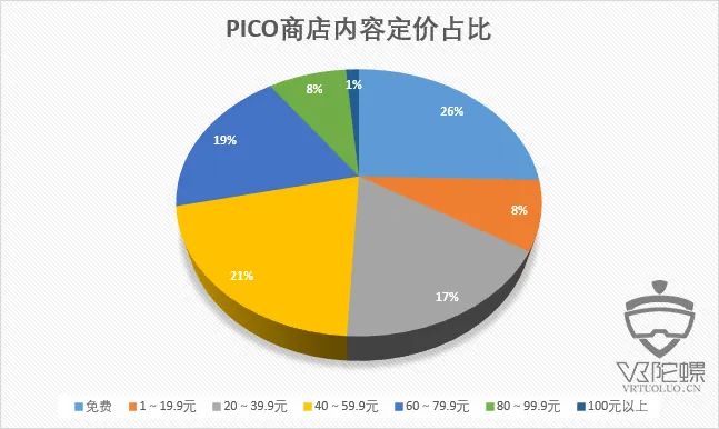 我国的主要VR用户群体并不是从主机、PC玩家中转移而来的硬核用户,更大多数是通常概念里的“泛用户”,即被一两个VR体验、视频或是直播所吸引,开始尝试虚拟现实设备并乐在其中。因此平台对于内容的定价相较海外市场也有着较大的差异,VR陀螺统计如下。