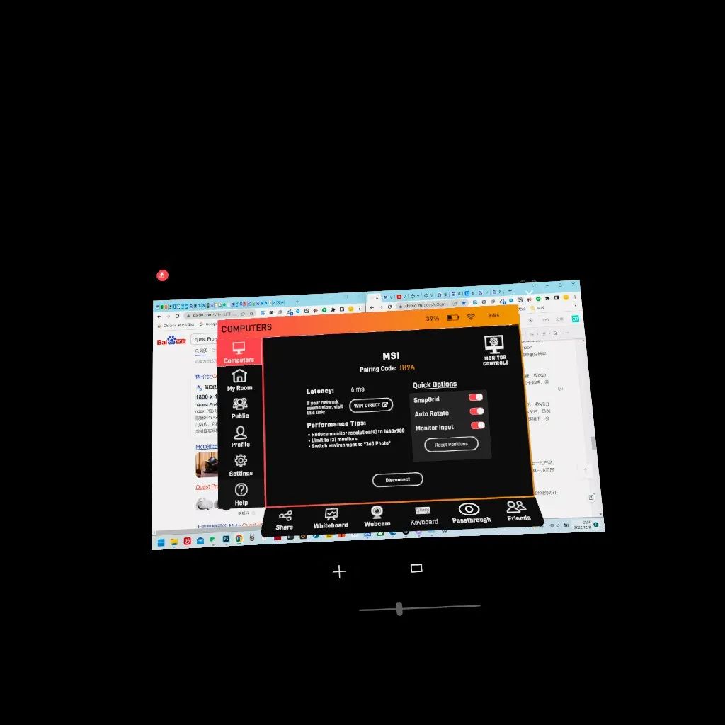 不得已,陀螺君又被迫安装了安卓版的谷歌浏览器。所幸的是,这个浏览器在Quest Pro中能正常打开,同时也可以实现中文输入,折腾到现在才真正实现了我最初设想的线上办公场景。