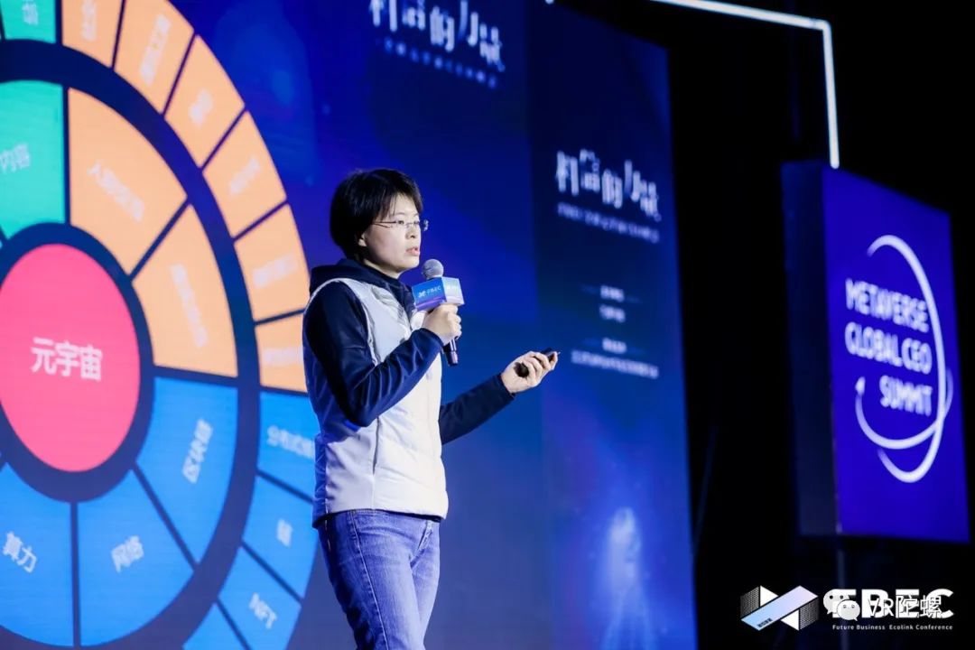 肖蓓蓓的主题演讲围绕着元宇宙的层次解构以及发展趋势展开,她认为,元宇宙不仅仅是一个游戏,未来的元宇宙可能是一个去中心化的世界,通过区块链可以穿梭在任何的子宇宙中,实现通用性。未来的元宇宙,是从数字孪生,到数字共生,再到数字永生的变革。