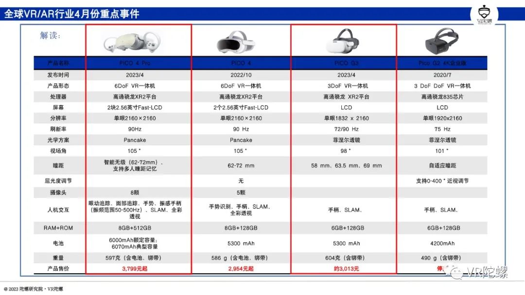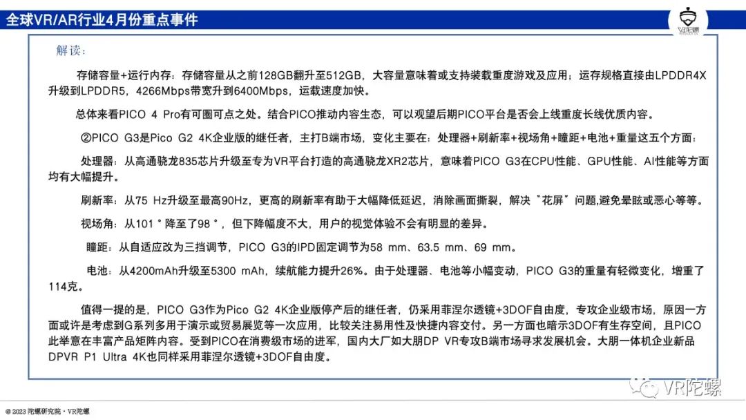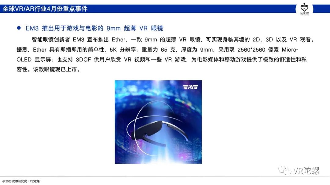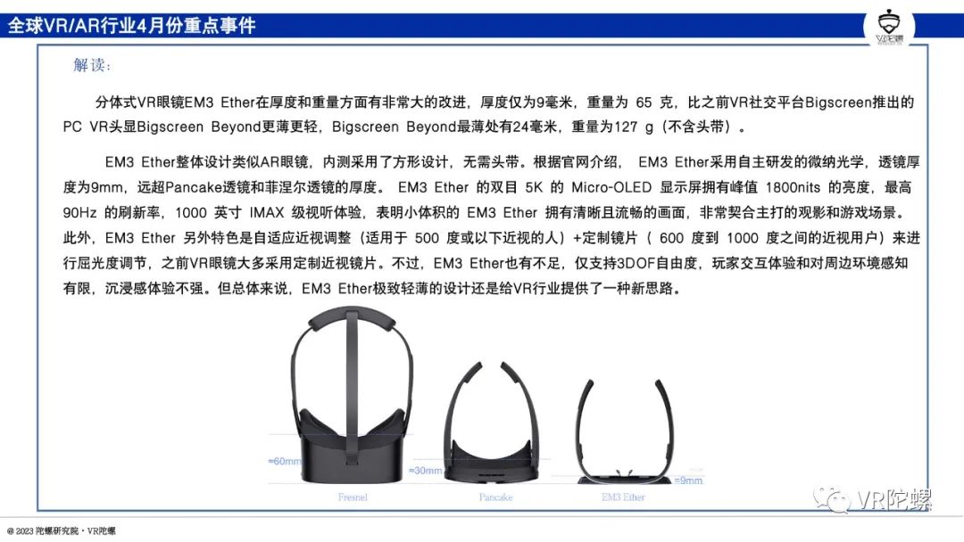 硬件方面,本月共有 5 款VR新品,分别为PICO 4 Pro、PICO G3、海信Vidda VR 一体机 XR-V3、EM3 Ether以及创维AR眼镜A1。除 EM3 Ether外,其余三款VR头显的特点为均采用LCD屏,双目4K分辨率,且形态均为VR一体机,视场角约100°左右,头显重量600g左右, PICO G3、海信Vidda VR 一体机为面向B端的产品,用户群体更为精准。而 EM3 Ether 是4月比较亮眼的 VR 新品,厚度仅 9mm ,重量仅 65g,且采用Micro-OLED显示屏,具有双目5K的分辨率,极其轻量化。创维的收款AR眼镜则采用Birdbath光学方案,主打观影、办公等。