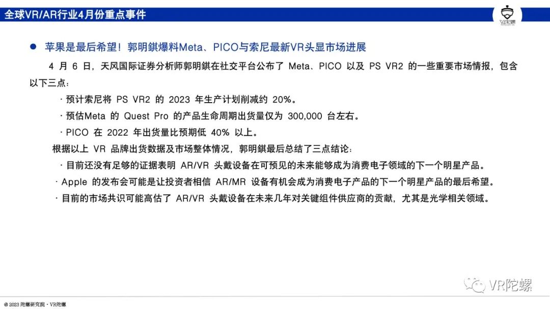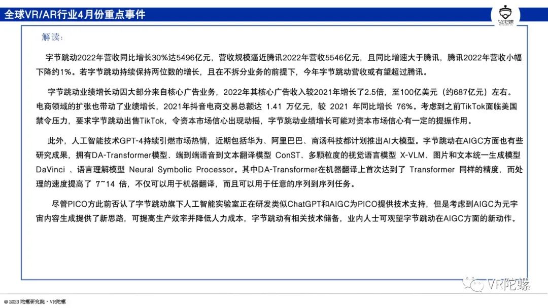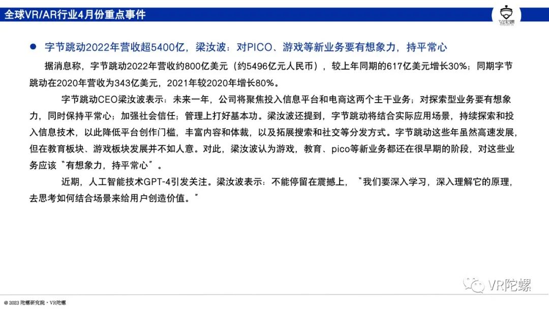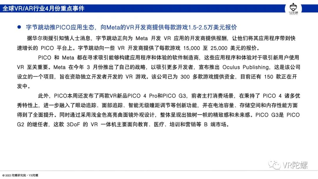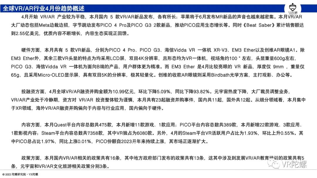 4月开始 VR/AR 产业较为平稳,本月国内 5 款VR/AR新品发布,各有所长;苹果将于6月发布MR新品的声音也越来越密集。本月 VR/AR 大厂动态包括Meta边裁边招,字节跳动发布PICO 4 Pro及PICO G3 2款新品,推动PICO应用生态增长等。同时《Beat Saber》累计销售额达到2.55亿美元,优质内容不断增长,内容生态实现正回馈。