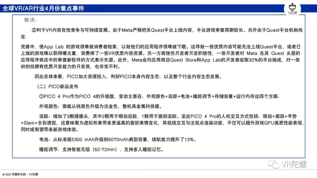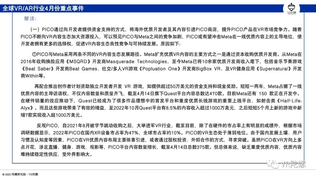 内容方面,本月Quest平台内容总数共475款,本月新增11款游戏、1款应用;PICO平台内容总数共389款,本月新增22款游戏、3款应用、 1款影视内容;Steam平台内容总数共7358款,其中VR独占为6080款。另外,4月的Steam平台VR活跃用户占比为1.93%,环比上升0.55%。其中PICO总占比1.97%,同比上涨0.01%,PICO份额自2023开年来持续上涨,其市场正逐渐扩大。