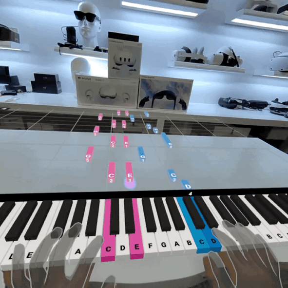 笔者体验了《PianoVision》的虚拟琴键模式,它就像是 MR 版的《节奏大师》那样,伴随着从迎面而来的音键,需要进行不停的点击、长按、同时按等操作,以弹出美妙的音乐。