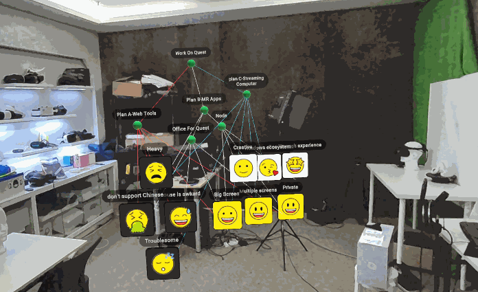 下图是陀螺君基于《noda》所创作的关于MR办公的思维导图,虽然应用不支持中文,但整体而言还是一种十分新奇的体验。值得一提的是,软件付费版支持云端空间锚点功能,这也就意味着在某些场景下,你甚至可以将它充当为虚拟标签机使用。