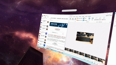 陀螺君所使用的是《Immersed》(很重要的原因在于它是免费的),这款应用同样支持打开多个虚拟窗口,基于展示需要,陀螺君同时打开了三个电脑虚拟大屏,左侧放置微信以及图像编辑工具,中间为在线文档,右侧则是一个新闻资讯页面。实际上,陀螺君平日工作时并不会用到那么多窗口,但是基于VR可以轻松实现这一点。