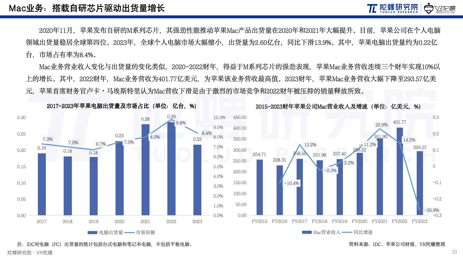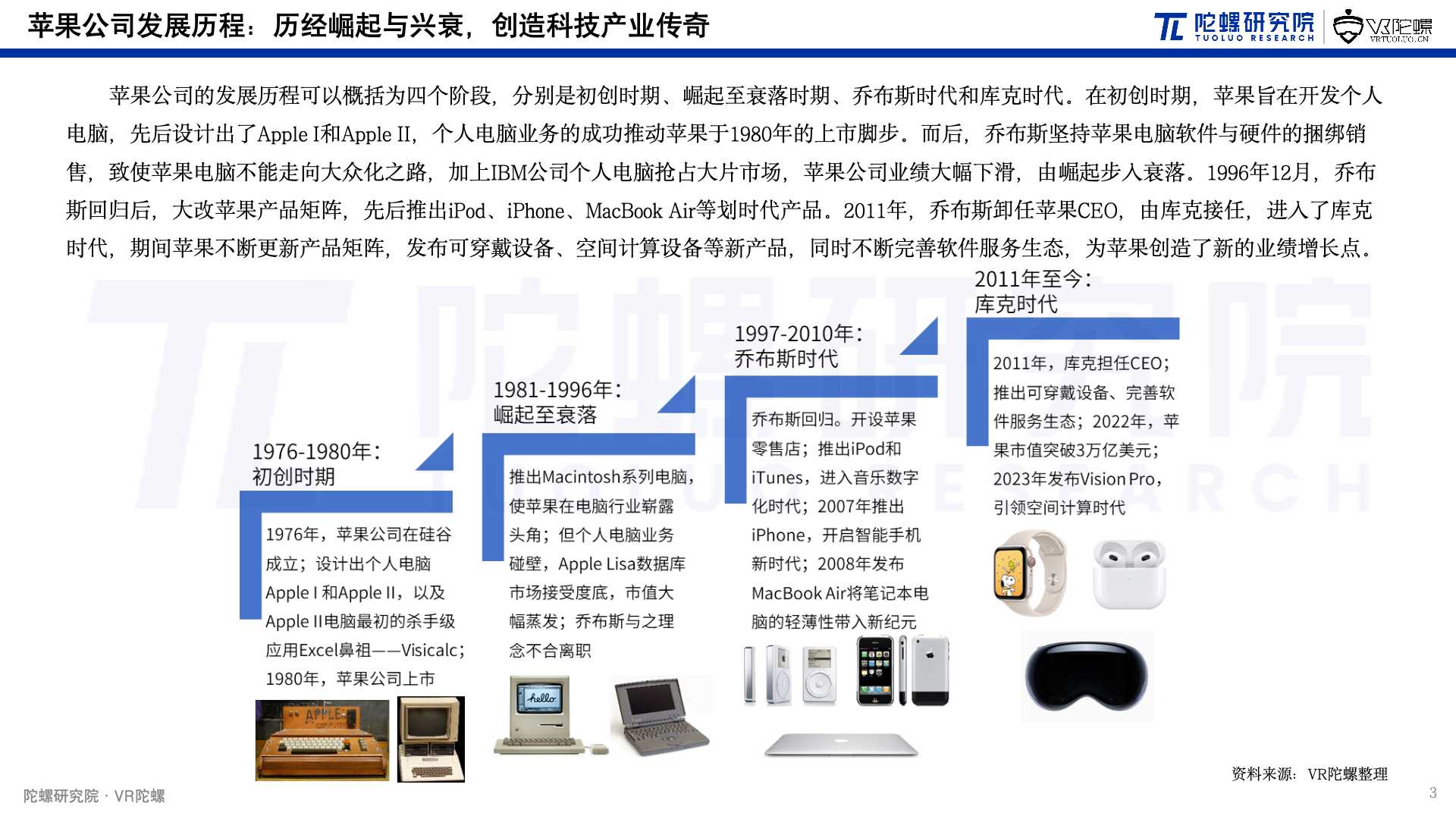 1996年12月,乔布斯回归后,大改苹果产品矩阵,先后推出iPod、iPhone、MacBook Air等划时代产品。2011年,乔布斯卸任苹果CEO,由库克接任,进入了库克时代,期间苹果不断更新产品矩阵,发布可穿戴设备、空间计算设备等新产品,同时不断完善软件服务生态,为苹果创造了新的业绩增长点。