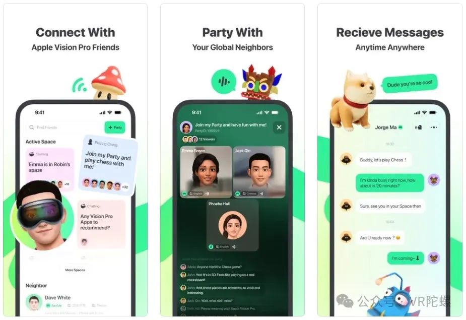《inSpaze》用户可以随时随地“开Party”,邀请全球Vision Pro用户加入房间,与陌生人社交,用户在举办派对时可以保持多人在线。