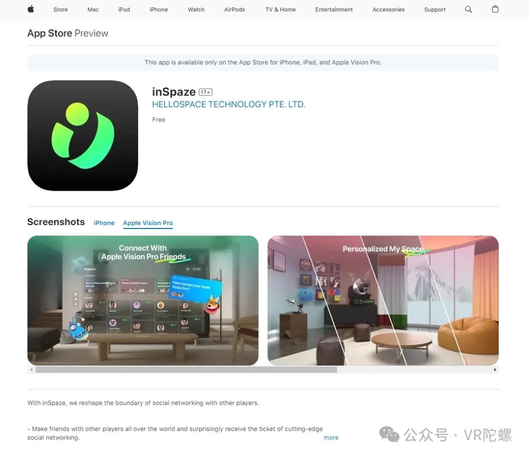 挚文集团宣布2月2日(美国时间)在App Store正式推出沉浸式社交应用《inSpaze》,作为600款原生应用的一员与苹果Vision Pro同步上线。
